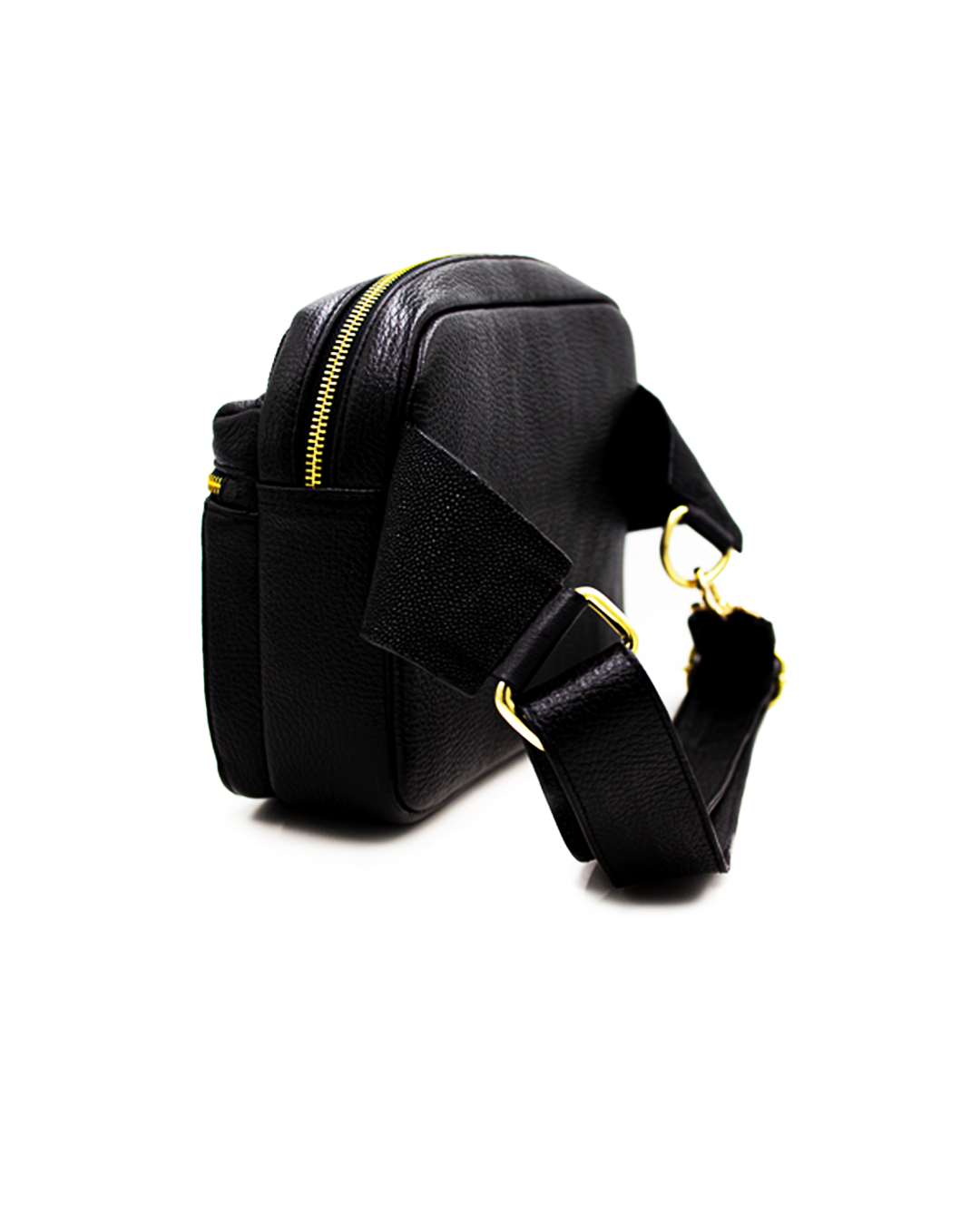 Poder silencioso: cangurera confeccionada en piel auténtica de mantarraya, con su distintiva textura perlada que irradia lujo discreto, mientras los herrajes metálicos complementan su carácter sofisticado.